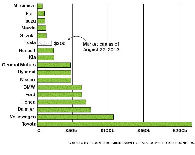 对于一家成立10年的汽车制造商来说,这是一个令人震惊的里程碑,目前该公司目标是今年交付仅21000辆豪华轿车。虽然特斯拉在福特的美国月销售中占有1%的份额,但这家电动车公司已经拥有福特640亿美元市值的近三分之一。投资者将特斯拉的估值大约定为通用汽车480亿美元市值的41%。实际上,特斯拉现在的价值超过了铃木汽车、马自达汽车和菲亚特,后者是克莱斯勒集团的主要股东,根据彭博社的数据。