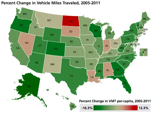 自2004年全国人均行驶里程达到峰值以来,几乎每个州的驾驶量也有所下降:
