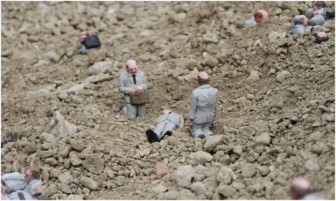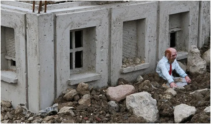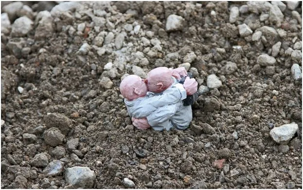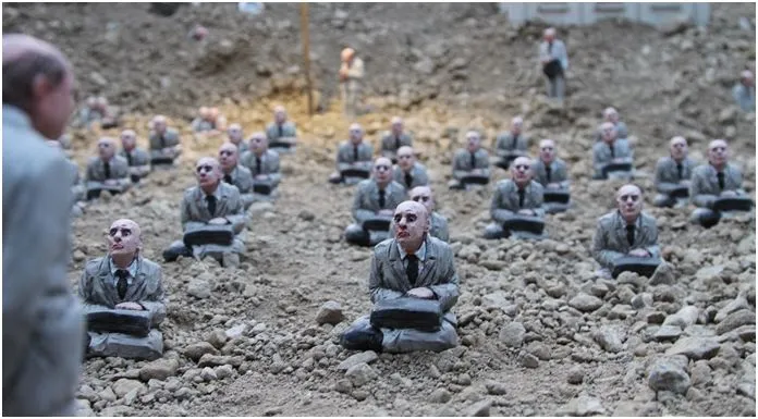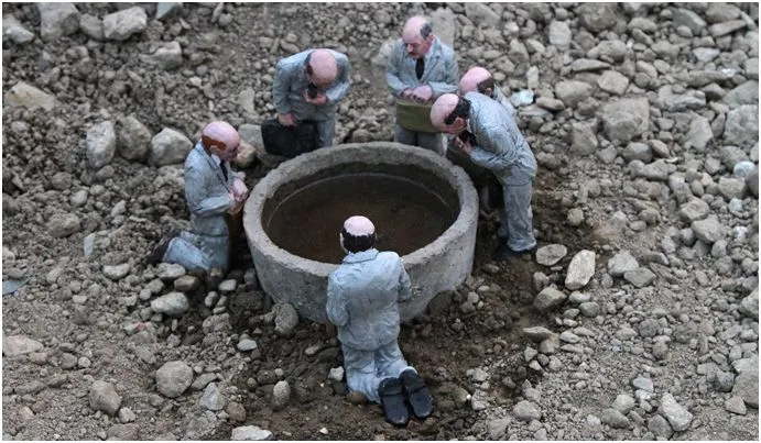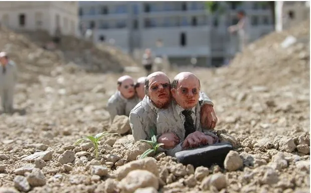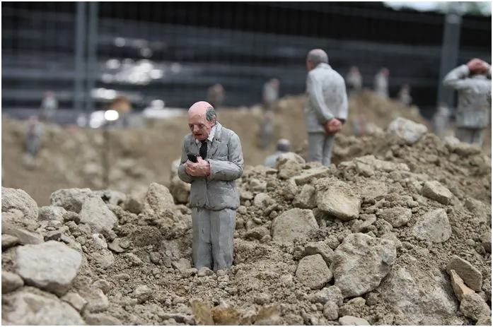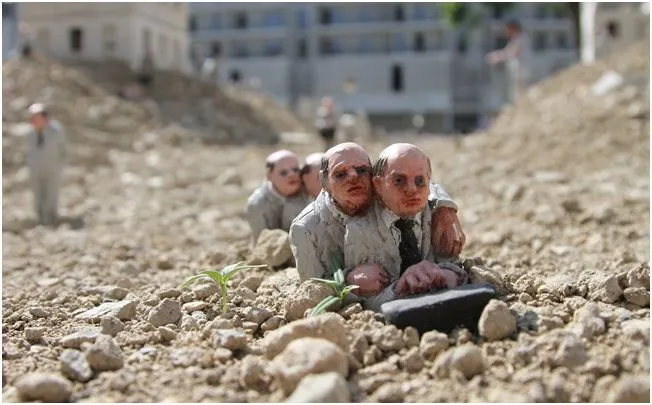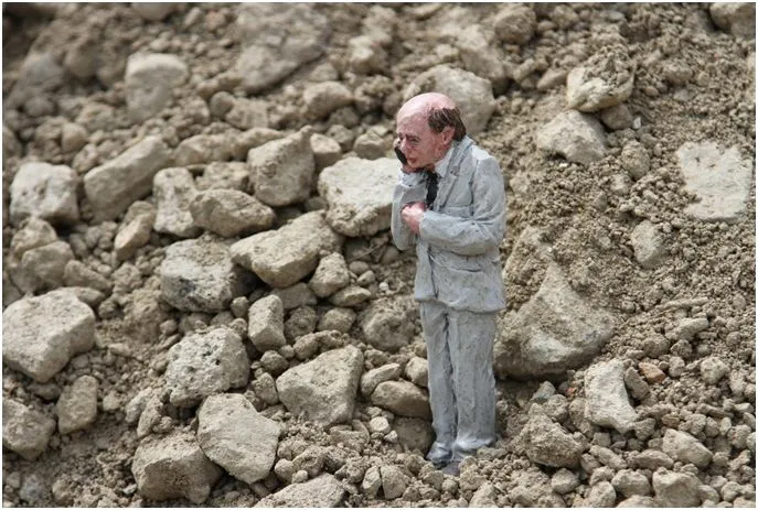 科达尔的混凝土后代并不享受轻松的生活——他们深陷泥土,腰部被 好奇的蜗牛 覆盖,像孩子为死去的金丝雀所建的坟墓一样,置于墓 mound 上。在南特的作品《跟随领导者 I》中情况也没有不同。他们沮丧地站在井边,跪在防暴警察面前,悬浮在建筑物的屋顶上,似乎在思考是否要跳下去,半埋在泥土中,仿佛大地决定要吞噬他们。这个装置旨在对我们作为社会整体的惰性进行“批判性反思,”艺术家 表示,他声称这与“经营全球社会光谱的商人”有关。