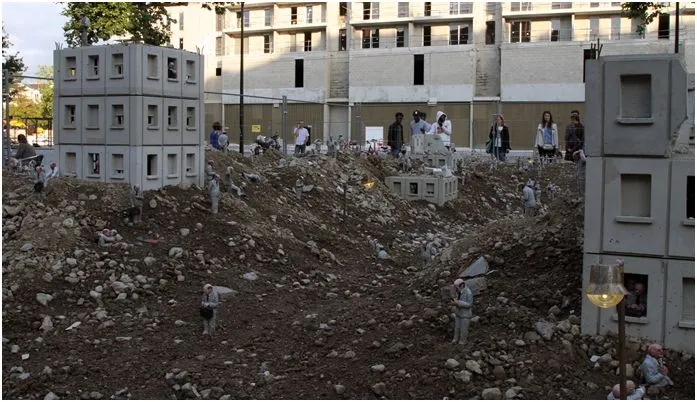深入 南特,一个拥有约90万人口的法国西部城市,你会发现自己站在另一个更小的都市的门口。玩具屋大小的公寓塔楼从一块泥土地上拔地而起,破裂的外观看起来像是刚刚遭到轰炸;在窗户后面潜伏和在街上徘徊的是身穿西装的小个子男人,他们小得连正常人类的脚都能把他们压扁。他们看起来完全预料到这种情况的发生,摆出自杀式的姿势,脸上挂着忧虑的表情。