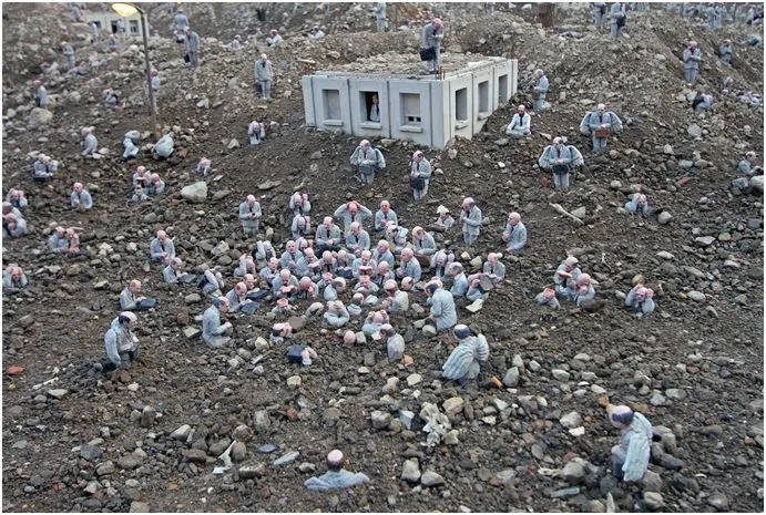 科达尔的混凝土后代并不享受轻松的生活——他们深陷泥土,腰部被 好奇的蜗牛 覆盖,像孩子为死去的金丝雀所建的坟墓一样,置于墓 mound 上。在南特的作品《跟随领导者 I》中情况也没有不同。他们沮丧地站在井边,跪在防暴警察面前,悬浮在建筑物的屋顶上,似乎在思考是否要跳下去,半埋在泥土中,仿佛大地决定要吞噬他们。这个装置旨在对我们作为社会整体的惰性进行“批判性反思,”艺术家 表示,他声称这与“经营全球社会光谱的商人”有关。