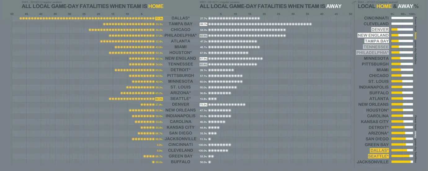 正好赶上下周四NFL赛季的开幕,“足球比赛日致死事件”,地图和分析由IDV Solutions的约翰·尼尔森提供,探讨了这种联系的一个更严峻的影响,比较了在NFL主场比赛日和客场比赛日,某个城市的交通死亡人数,涵盖了2001年至2010年的十个赛季。该分析和地图基于本地驾驶时间数据、球队赛程和国家公路交通安全管理局的交通死亡数据。