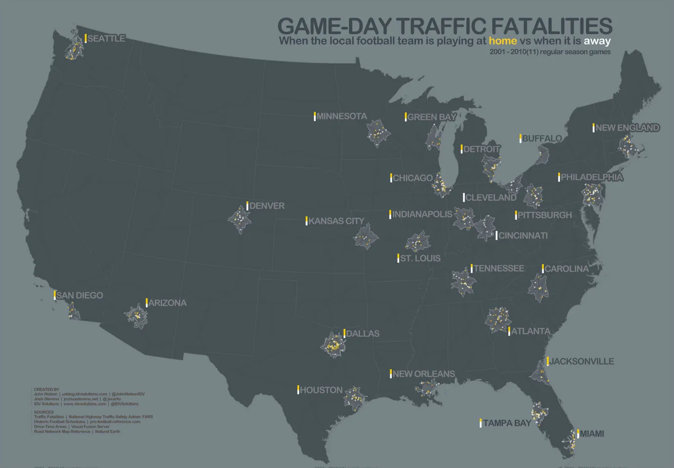 尼尔森和 制图师乔希·史蒂文斯 制作的地图如下。每个黄色点代表 NFL 主场比赛当天的一起交通死亡,而每个白色点则代表 NFL 客场比赛当天的一起死亡。关于不假设因果关系的通常警告在这种情况下显而易见。在相当多的城市中,交通死亡人数幸运地低到甚至不具统计学意义。而且,你会注意到一些国家较大的大都市地区——旧金山、纽约和巴尔的摩-华盛顿——没有被包括在内,因为没有简单的方法来区分两个 NFL 球队如此接近的影响。