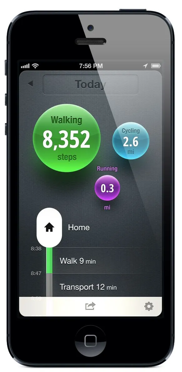 个人健身追踪器,如耐克的 Fuelband、Fitbit 和 Jawbone 的 UP,已在希望掌握日常身体活动的城市居民中变得相当流行。但这些设备要求用户购买设备(通常是手环),将其与数据应用程序同步,随身携带,并在家中充电。相比之下,使用 Moves 就像把智能手机带到你去的每一个地方——这当然是你已经在做的事情。