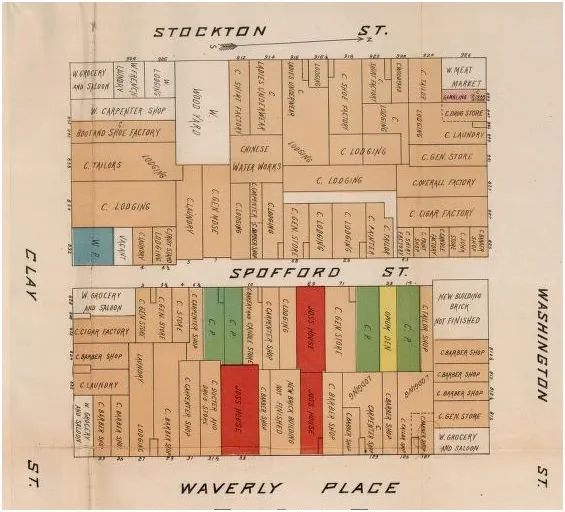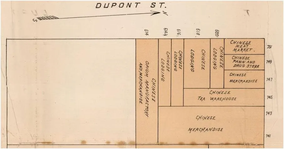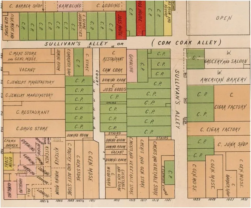 最后一句话解释了这个令人难以置信的街区。沙利文巷似乎已经不存在了——现在是杰森法院,位于杰克逊街和太平洋大道之间——但一个世纪前,它是最好的地方,可以找到亚裔妓女: