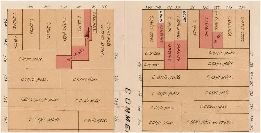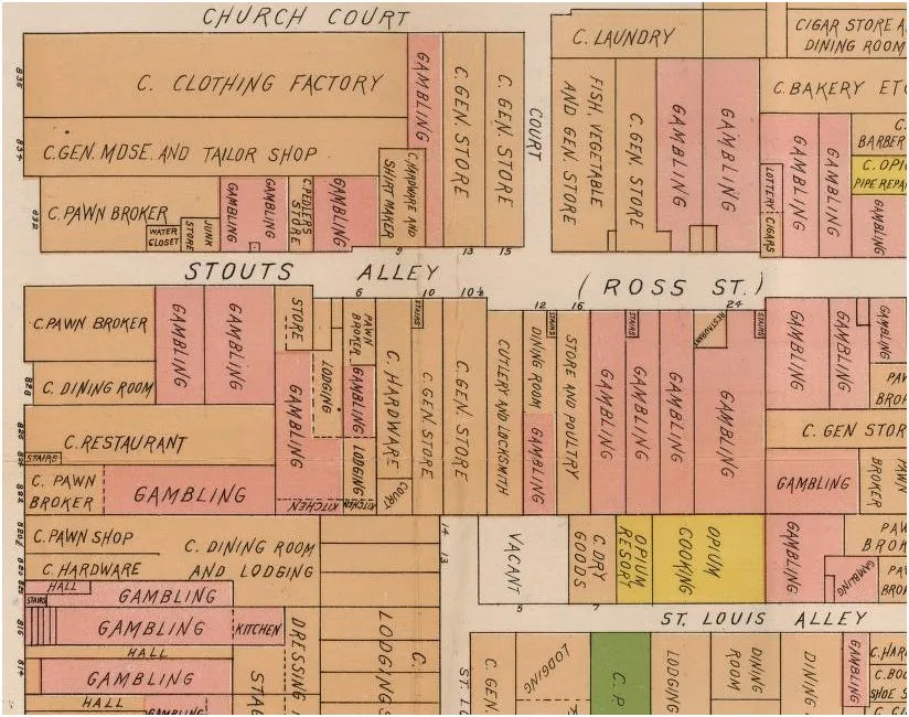 斯图茨巷(大约是今天的罗斯巷)一定是赌博区。还可以看看繁荣的鸦片经济,正如一个“鸦片烹饪”生意、一个你可以偶然发现的“鸦片度假村”,以及在杰克逊街的一个鸦片“管道修理工”。鸦片爱好者还需要什么呢?