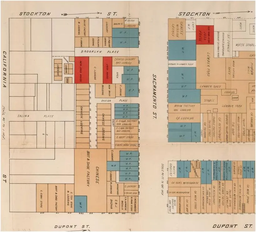 其他需要注意的事情:曾经有一个“女性医院”,在 今天 的地方有一个“华人新移民 服务中心”旨在帮助贫困和最近移民的人;还有一个“扫帚工厂”;以及雪茄店和 香火庙比比皆是。后者是居民可以向各种神灵和祖先致敬的庙宇。听说在北加州只剩下一个,在门多西诺。