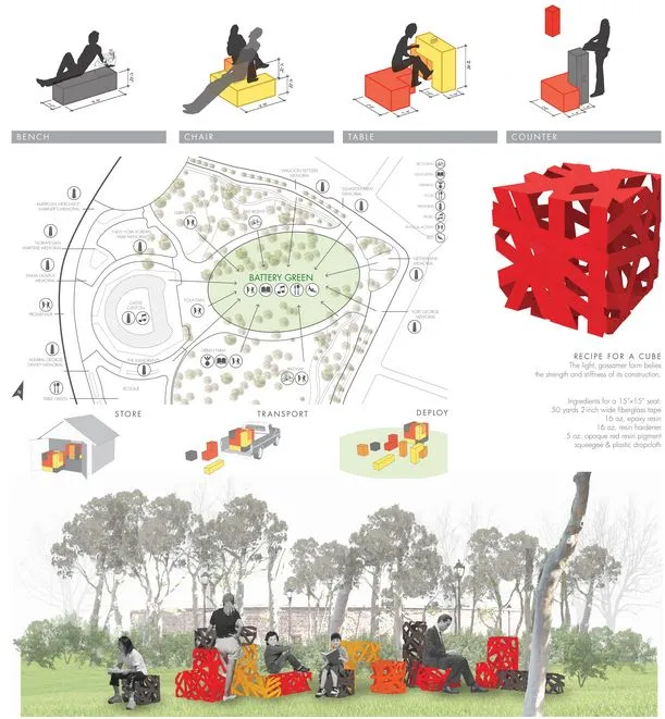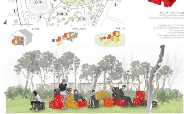 理解这个由“基于大豆的生态树脂”制成的模块化椅子可能有点困难——请将目光集中在顶部的图示上,看看它应该如何运作。基本上,这件家具以各种几何形状拆卸而成,就像幼儿的玩具积木。访客可以将它们组合在一起,形成最适合他们需求的家具,无论是阅读凳、躺椅、午餐桌,还是如果你是个大混蛋,使用公园里的所有零件搭建一个15英尺高的王座。给设计师写信,你知道他们玩过不少俄罗斯方块:“可携带公园作为一个三维拼图般的组合,适应人类的尺度,可以配置成无数形状,以支持在绿色空间内外发生的各种活动。”