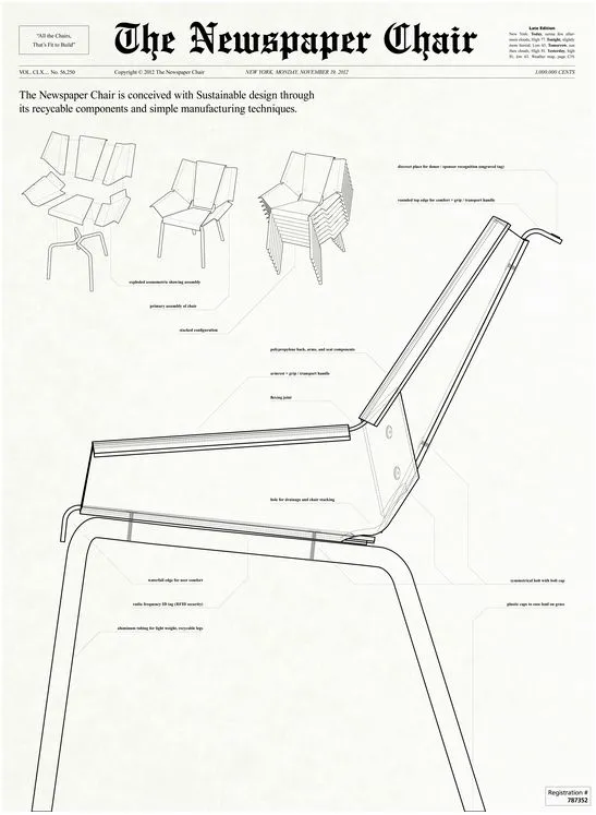 顶部的字体揭示了这把椅子所引用的报纸。构思这个设计的团队希望给压力大的纽约人一个安静反思的机会,因此他们设计了一个看起来像折叠 时报 的重叠表面。这个想法是椅子为人们提供一个心理提示,让他们放松。“椅子与阅读和观看行为的关联,会使用户专注于坐下和观察周围环境的行为,”他们说。