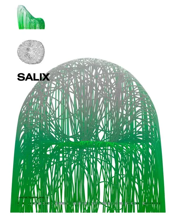 这个半透明的奇迹是通过将塑料纱线覆盖在一个后续移除的模具上制作而成。每把椅子都是独一无二的,得益于塑料中的一种化学物质,它还会在黑暗中发光。“椅子应该足够坚固,但也应该有一定的弹性,”它的创造者说。“就像大自然本身,它应该是适应性的。”(这个名字显然是指柳树,而不是帮助人们解决胃肠疾病的制药公司。)