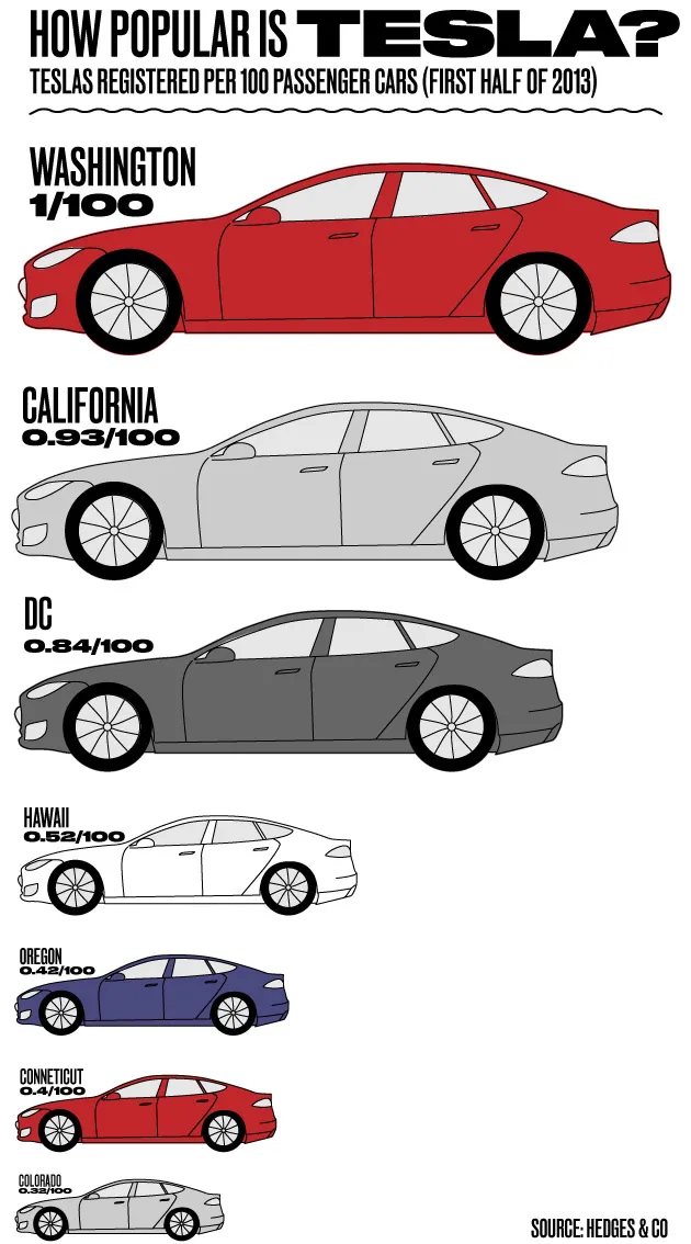 当然,从数量上看,加利福尼亚州被称为特斯拉之地。在2013年上半年,几乎有5,000辆特斯拉在金州注册——这大约是公司总产量的一半。考虑到特斯拉位于硅谷的总部,以及有能力支付超过70,000美元的价格标签的富裕早期采用者,确实有相当的主场优势。加利福尼亚的销售还受到多项州和地方补贴的推动,这些激励措施使得买家在全国范围内购买特斯拉时可以享受7,500美元的联邦税收抵免。
