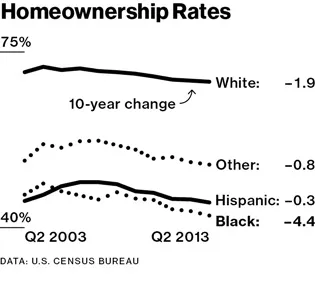 大多数美国人发现房地产崩溃终于过去,他们的个人财富回到了繁荣时期的水平。然而,对于美国的许多黑人来说,多年的经济进步已经消失。根据人口普查局的数据,房屋拥有率从房地产繁荣时期的50%下降到第二季度的43%,这是自1995年以来的最低水平。白人的房屋拥有率在两年前停止下降,稳定在约73%,仅比2004年的峰值低3个百分点。