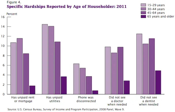 Shutterstock本周发布的人口普查数据显示,美国的生活条件自经济衰退前夕以来以一种比单纯衡量我们支票账户更不明显的方式恶化。从2005年到2011年,无法满足基本开支的美国家庭数量增加了16%(达到1910万户)。这些家庭在支付租金或公用事业费用方面遇到了困难,他们的电话或公用事业服务被切断,有时缺乏足够的食物,或者在真正需要时无法看医生或牙医。