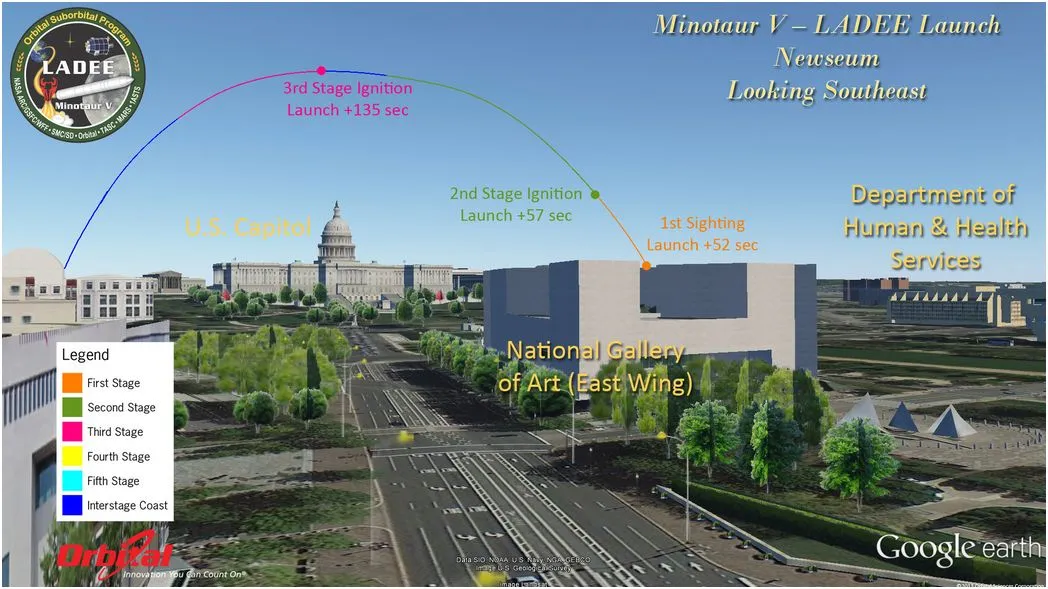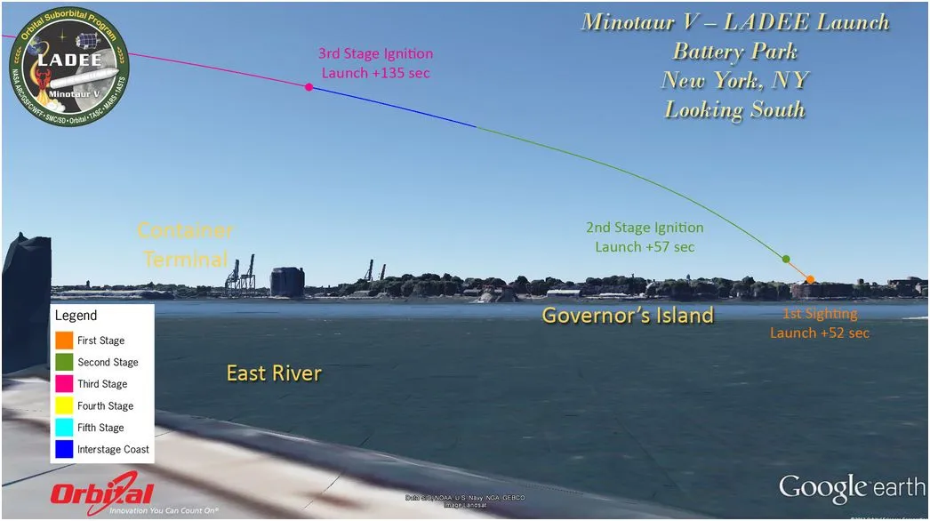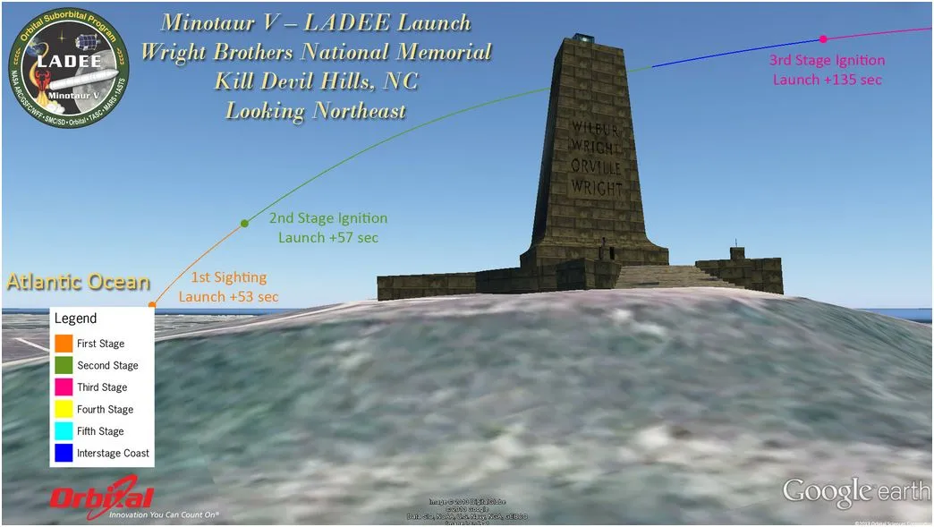 在图形中,轨迹似乎向地球倾斜,因为火箭远离观察者并消失在地平线之外。当然,火箭并没有返回地球——它正在继续上升,向太空加速飞行。在飞行过程中,米诺陶尔V将抛弃已经耗尽燃料的火箭级。这些在大气中无害地解体并落回海洋。第五级与LADEE航天器一起被送入高地轨道。一旦与第五级分离,LADEE将使用自己的引擎继续前往月球的任务。