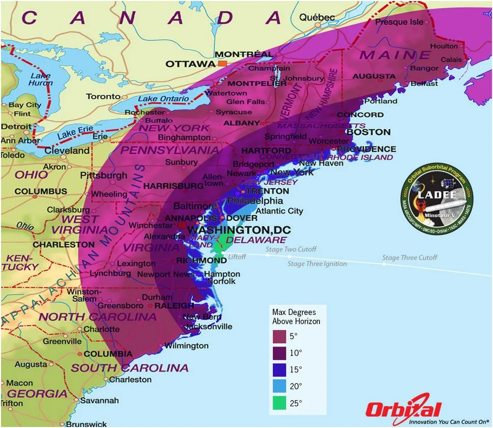 这枚火箭携带着一颗名为 NASA 的月球探测器,叫做 LADEE(“小家伙”),将以大约10到15度的低空飞行。位于弗吉尼亚州辛科特格的沃洛普斯飞行设施附近的人们显然将拥有最佳的观赏视角(以及听觉体验——一些发射的声音如此之大,以至于NASA有一个 声音抑制系统 来防止声能损坏航天飞机部件)。但是愿意远离城市天际线或攀登高处的人们可以在布法罗、匹兹堡、格林斯伯勒和其他远离海岸的城市目睹这一壮观场面。