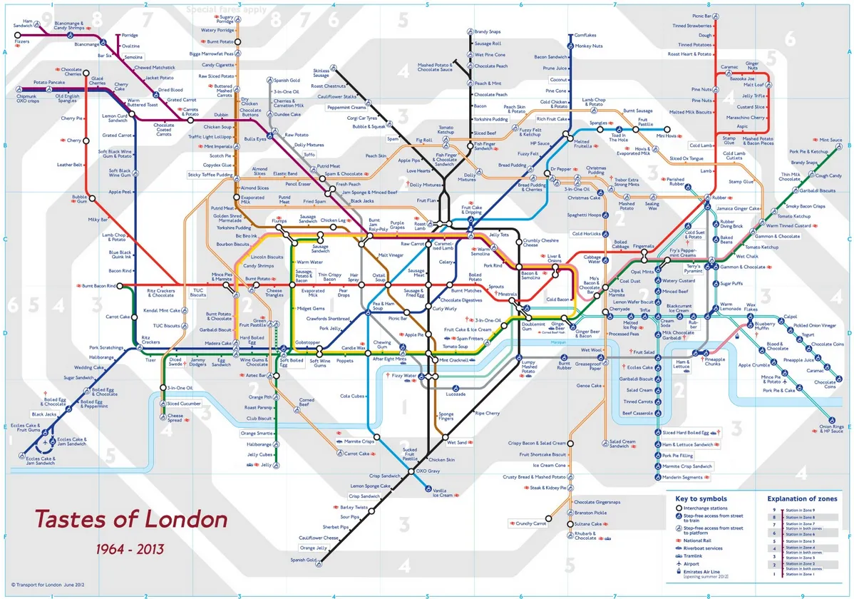 詹姆斯·万内顿的“伦敦味道”地图。由詹姆斯·万内顿和伦敦交通局提供。点击这里查看更大版本他花了49年时间访问并记录所有360个地铁站的味道。他最后一个访问的站是在二月份,万内顿觉得它的味道像洋葱圈和HP酱。大多数情况下,味道没有变化,“尼兹登 在我五岁时是冷的切片土豆,今天仍然是冷的切片土豆,”万内顿说,并补充道,“一致性是联觉的一个定义特征。”