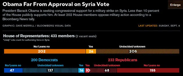 然而,对奥巴马来说,更糟糕的是,已经决定的立法者之间的分歧显示反对票远多于支持票。这在共和党控制的众议院尤为明显,奥巴马需要217票支持,却面临一个准备投反对票的202人团体。即使所有137名目前未决定的民主党人最终投票授权攻击,奥巴马的票数仍然只有163票,仍然不足217票。因此,他需要共和党的支持。