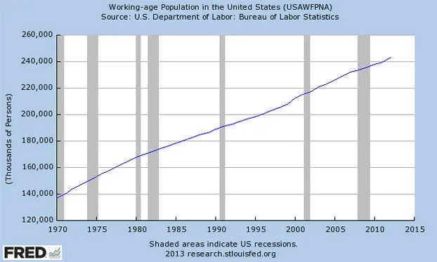 就其人口而言,美国可能根本缺乏推动国内生产总值增长超过2%的必要人口动力。看看劳动力的增长率,这通常被认为是经济扩张的关键因素。根据美联储的数据,在1970年代,工作年龄人口(20至65岁的人)每年平均增长2%。自那时以来,这一增长率一直在下降,从80年代的1.2%降至90年代的1.17%,再到2000年代的1.13%。从2006年到2011年,工作年龄人口每年增长不到1%。