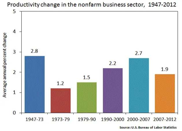 更糟糕的是,生产率也放缓了。根据 美国劳工统计局的数据,年生产率增长从1970年代初期到2007年稳步加快。从2007年到2012年,它降至1.9%,而在前七年为2.7%。因此,美国不仅劳动力增长缓慢,而且国家从工人身上榨取更多产出的能力也停滞不前。
