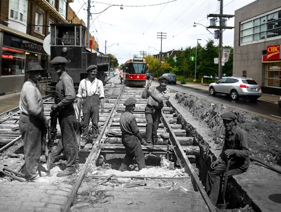虽然结果总是很有趣,但一张将今天的电车与1923年修建轨道的工人结合在一起的图片让恩钦印象深刻。“那时他们正在为城市建设基础设施,”摄影师说。“他们不知道自己正在为80年后的基础打下基础。”