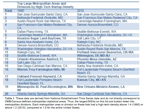 2010年前20名中只有五个城市——波特兰、威尔明顿、凤凰城、堪萨斯城和新奥尔良——在二十年前并不是科技密度最高的城市。报告指出,即使是最近开始攀升高科技排名的城市,如堪萨斯城和波特兰,实际上也“将其新兴的创业生态系统归功于多年的衍生和创业孵化”。