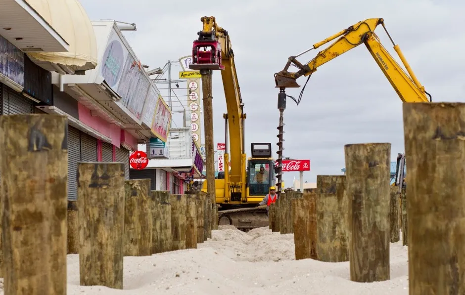 顶部图片:一支施工队在新泽西州海滨高地继续重建木栈道时,将桩打入沙中,2013年2月22日。(路透社/汤姆·米哈莱克)