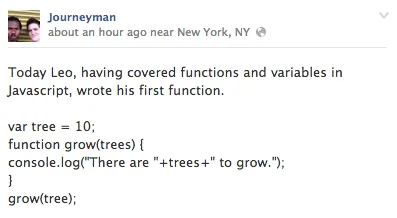 麦康洛格建立了“Journeyman”,一个Facebook 页面来记录这个过程。在八月底宣布计划的两天后,麦康洛格给里奥送去了配备3G的三星Chromebook和一本《初学者的JavaScript》书。在第一周,这对搭档学习了JavaScript中的函数和变量,里奥写了他的第一个函数,并在Facebook上分享了他创建一个环境变化网站或移动应用的目标。现在,里奥在GitHub上开设了 两个 账户来存储他的代码,其中一个将专门用于他即将推出的应用。麦康洛格通过电子邮件写道,上周,里奥开始了一个项目,涵盖“终端命令、对象、类和变量”。