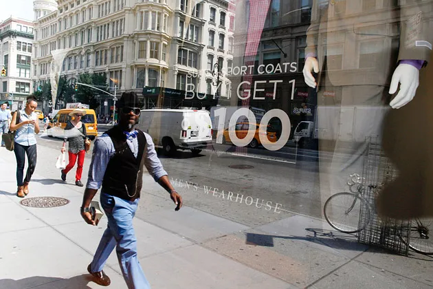 一名行人映照在纽约一家男士服装店的玻璃窗外,时间是6月25日摄影:Eric Thayer/《纽约时报》通过Redux如果你拥有男士服装店的股票,今天早上你可能不会喜欢自己的样子。