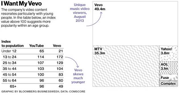 考虑到竞争对手的背景和起步,Vevo在在线音乐视频领域的主导地位令人惊讶。根据研究机构 ComScore 的数据,该公司在8月获得了4940万独立访客和6.09亿次视频观看,远远超过了其最近的竞争对手, MTV音乐集团(3530万独立访客;2.61亿次视频观看), 雅虎!音乐(380万独立访客;750万次视频观看),以及 AOL(310万独立访客;810万次视频观看)。