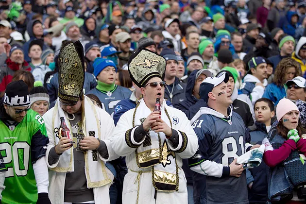 新奥尔良圣徒队的球迷在2011年1月8日的西雅图被西雅图海鹰队的主场观众大大超过摄影:汤姆·霍克/AP 图片西雅图海鹰队认为他们的球迷并不是很热情的东道主。在周日的比赛中,球队将有便衣警察在看台上巡逻,伪装成客队旧金山49人队的支持者,任务是抓捕一些世纪链接体育场中更阴险的暴徒。理论上,当然,穿着不当的外地观众成为任何醉酒狂欢者的主要目标。