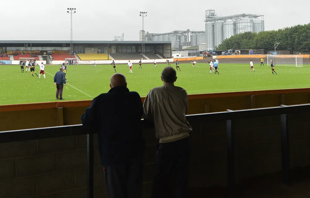 2013年8月24日,两个球迷在英格兰东北部的贝尔威克的希尔菲尔德公园体育场观看贝尔威克流浪者队的预备队比赛。尽管该镇位于边界的英方一侧,但该镇的足球队在苏格兰联赛中比赛。路透社/托比·梅尔维尔