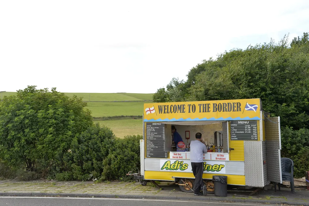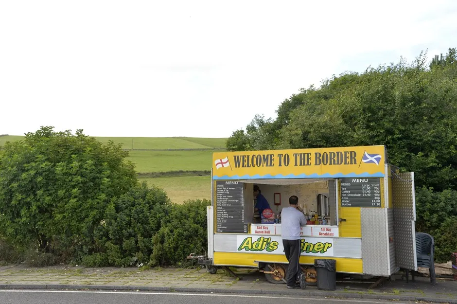凯瑟琳·马尔特曼在她的零食车“欢迎来到边界”中为顾客服务,地点位于靠近贝尔威克的A1公路上的英格兰-苏格兰边界,2013年8月21日。路透社/托比·梅尔维尔