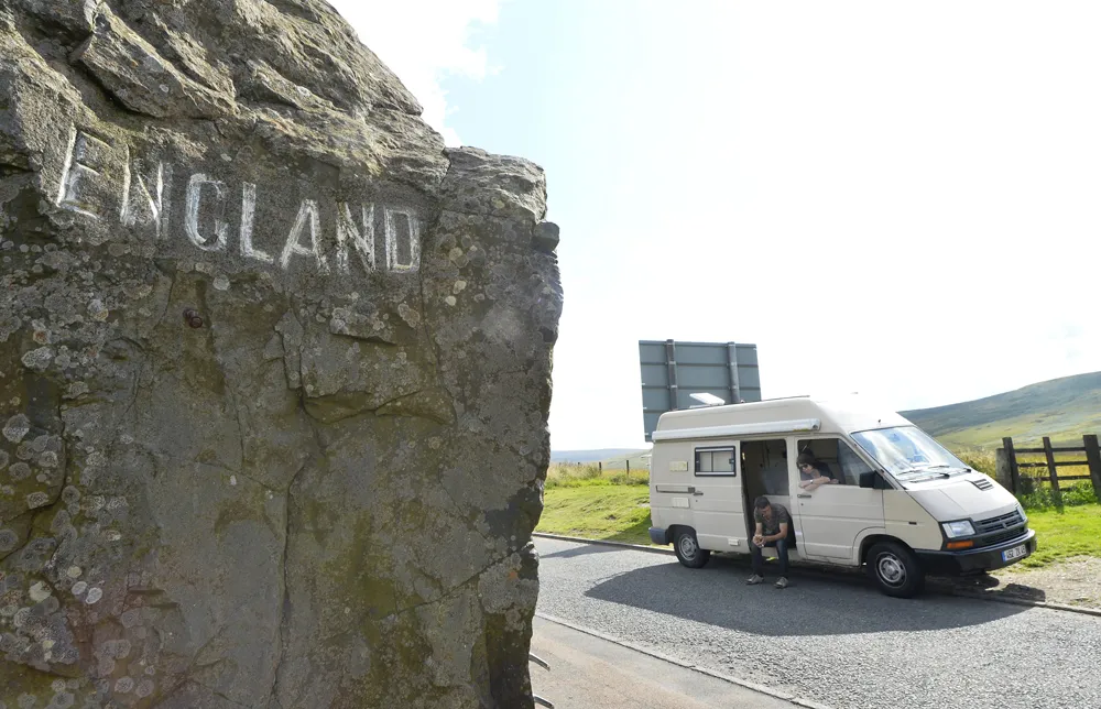 瑞士游客在标记英格兰-苏格兰边界的道路旁拍照,地点位于靠近贝尔威克的A1公路的停车区,2013年8月20日。路透社/托比·梅尔维尔