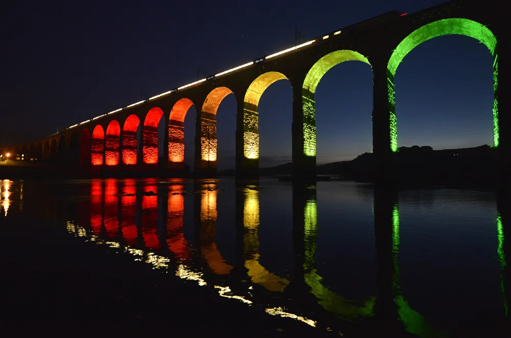 2013年8月22日,一列火车在北umberland的贝尔威克-阿庞-特威德的皇家边界桥上穿越时,映照在特威德河中。皇家边界桥于19世纪中叶开放,完成了从伦敦到爱丁堡的铁路连接。它位于贝尔威克-阿庞-特威德,英格兰最北端的城镇,该镇曾多次在英苏控制之间交替。路透社/托比·梅尔维尔