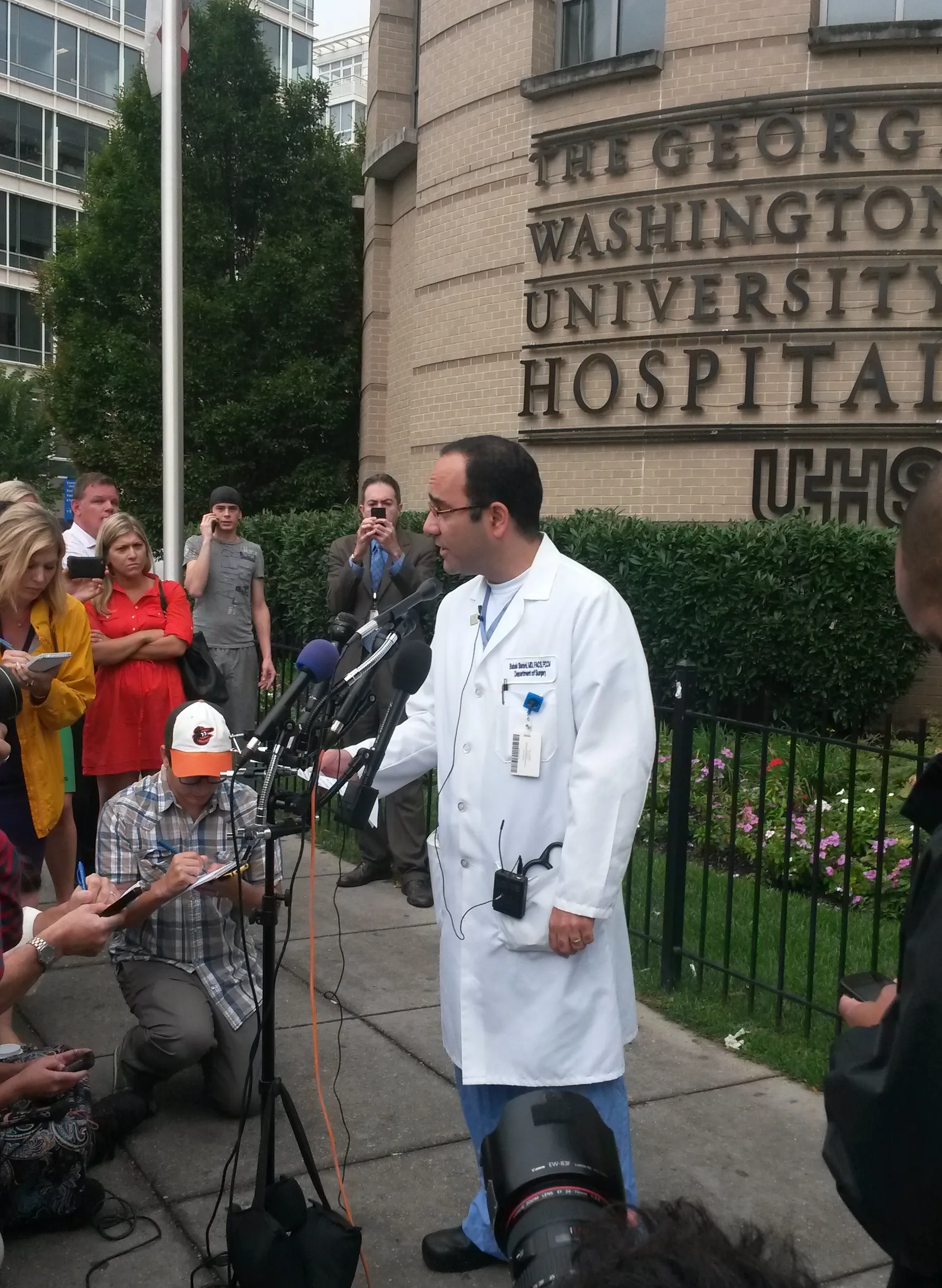 上午11:35一位明显情绪激动的华盛顿医院中心代表正在举行新闻发布会。医院正在治疗一名警察和两名平民受害者。三人均处于危急状态。一名男性患者双腿有枪伤,一名女性患者肩部中枪,第三名女性受害者头部和手部有枪伤。三人都有很好的生存机会。