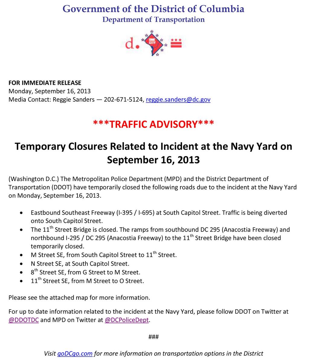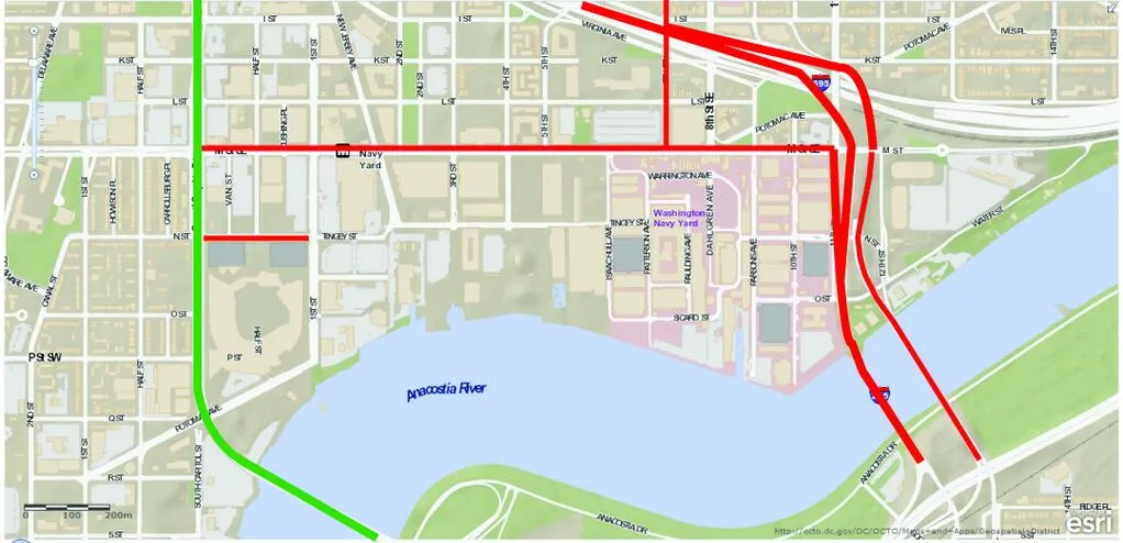 **下午3:34:**华盛顿特区交通部发布了一份更新的道路封闭名单,涉及海军造船厂周围的情况。以下是该封闭区域的地图: