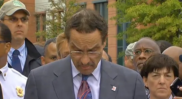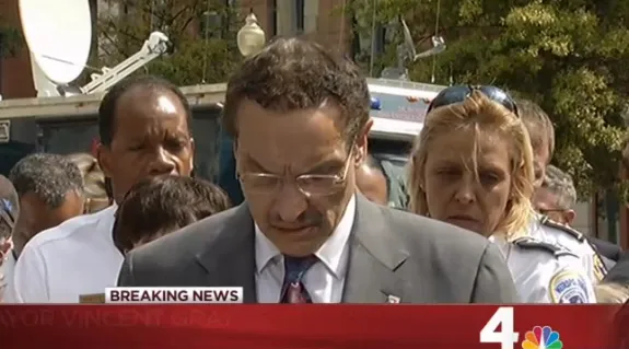 下午12:12: 华盛顿市长文斯·格雷向媒体谈论海军造船厂枪击事件。