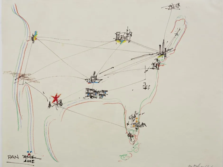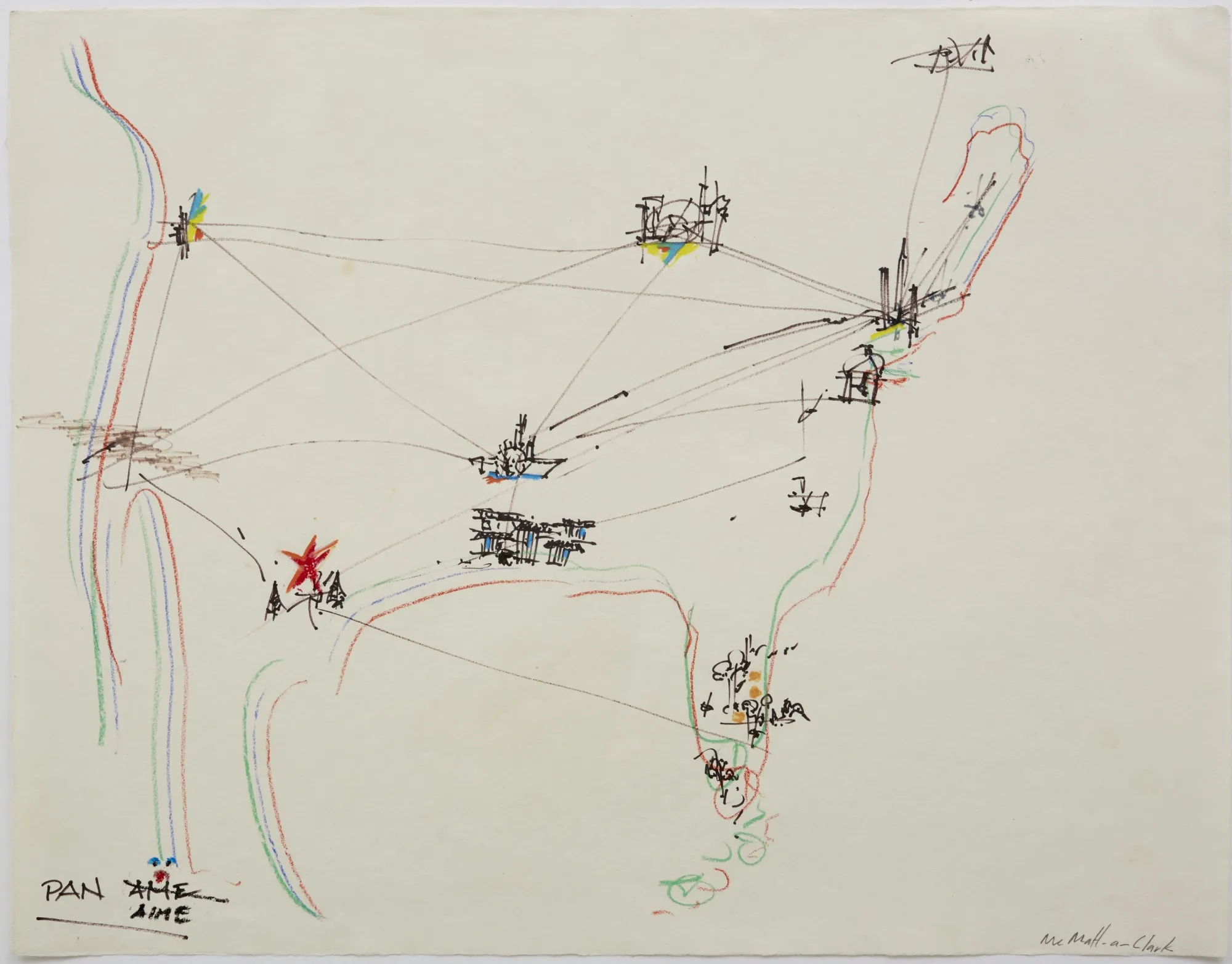 在1970年代初,日本艺术家高桥久近请22位同事绘制美国地图。他想知道其他艺术家对他现在称之为家的国家的看法,但他的英语说得不太好,因此这些绘画成为了一种普遍表达的形式。但这个简单的请求也有一个条件:艺术家们必须凭记忆进行绘画。