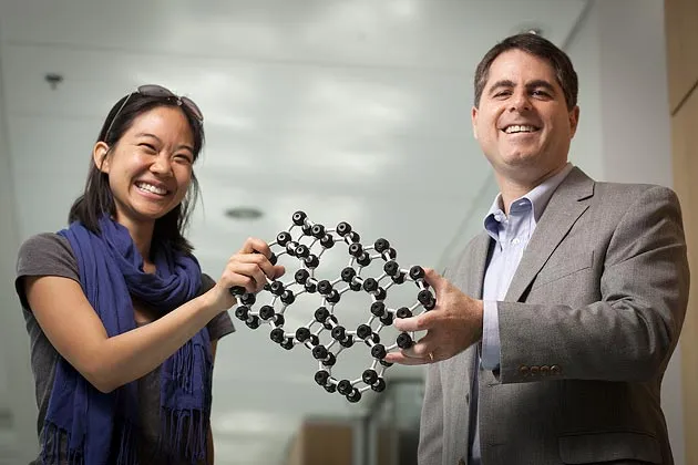 康奈尔大学研究生Pinshane Huang和教授David Muller与一个描绘玻璃原子结构的模型照片由Jason Koski拍摄;康奈尔大学提供