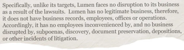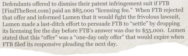 萨缪尔斯指出,提出极其广泛的信息要求是专利流氓的常用策略,因为与法律斗争相关的发现过程既可怕又可能昂贵。这种全面的发现似乎并不旨在建立更强的法庭案件。尽管有关于准备“全面诉讼”的夸夸其谈,但根据FindTheBest的投诉,Lumen似乎对将专利争议提交法庭并不感兴趣。随着这种情况似乎更有可能发生,Lumen发现自己更倾向于谈判: