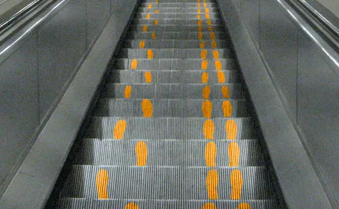 Alter的提案呼吁使用高度可见的橙色贴纸,标示右侧为静止,左侧为移动。设计师最初尝试了黄色脚印,但认为这可能会与双黄线混淆。Alter通过电子邮件写道,已经有音频公告和标志提醒人们站在右侧并从左侧通过,但在充满广告的环境中,这两者都没有效果。另一方面,他的亮色、显眼的设计旨在穿透交通中心的“视觉噪音”,超越语言障碍。
