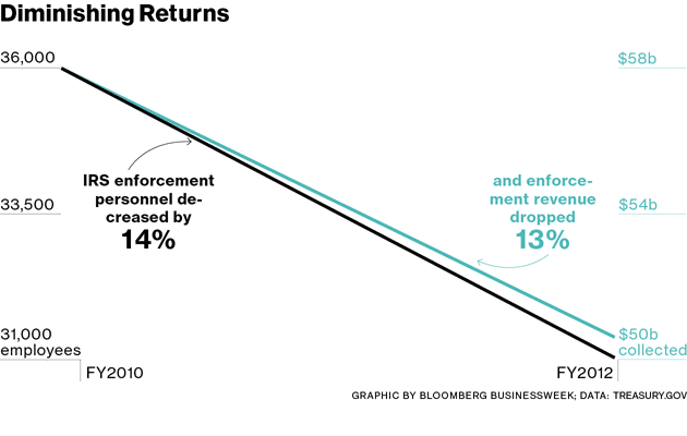 根据刚刚发布的 报告(PDF),国税局的预算在2010财年至2012财年期间几乎下降了3%。这些削减迫使国税局裁减了8,000名全职员工,其中5,000名是审计员。这些裁员相当于该机构执法人员减少了14%,导致国税局通过审计收集的资金下降了13%。