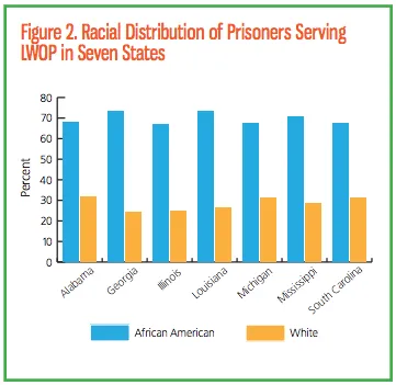 在全国范围内,几乎一半(47.2%)的无期徒刑囚犯是非裔美国人,尽管在马里兰州(77.4%)、乔治亚州(72.0%)和密西西比州(71.5%)等州,终身监禁的黑人比例更高。在联邦系统中,62.3%的无期徒刑人口是非裔美国人。非白人几乎占服无期徒刑总人口的三分之二。