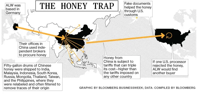 ALW依赖于来自中国和台湾的经纪人网络,他们将蜂蜜从中国运往印度、马来西亚、印度尼西亚、俄罗斯、韩国、蒙古、泰国、台湾和菲律宾。这些50加仑的桶在这些国家重新贴标签后送往美国。蜂蜜通常会经过过滤以去除花粉,这可能有助于识别其来源。一些蜂蜜被掺入了米糖、糖蜜或果糖浆。
