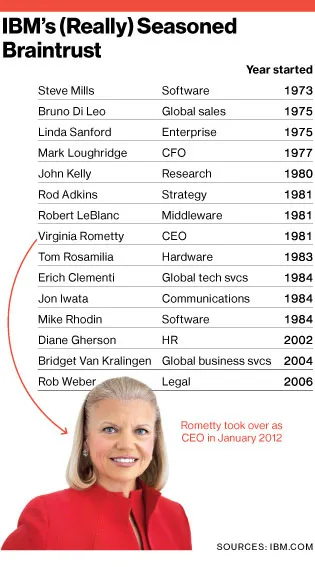 插图由731提供这对于前沿科技来说怎么样:IBM高级执行领导团队的平均成员在1985年加入公司,那时互联网仍然是一个政府项目,史蒂夫·乔布斯刚刚被 苹果 解雇。首席执行官吉尼·罗梅蒂于1981年加入IBM,刚从西北大学的工程学院毕业两年,并一直在这里工作。
