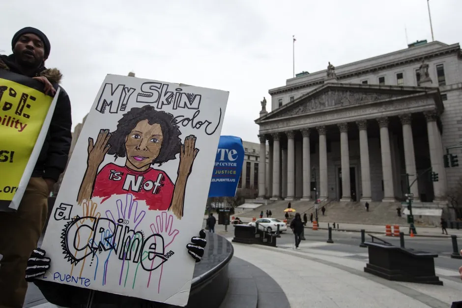 顶部图片:示威者在2013年3月18日纽约曼哈顿联邦法院外举着标语,抗议纽约警察局的“临检”打击犯罪战术。路透社/卢卡斯·杰克逊
