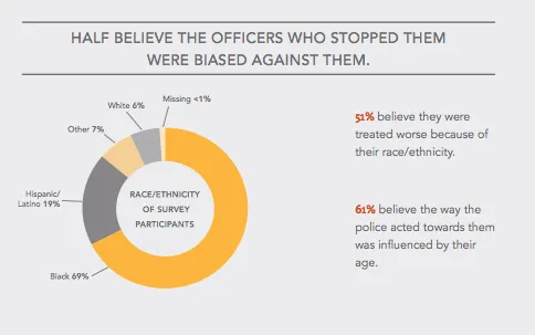 该小组 发现 的结果相当令人震惊:71%的这些年轻成年人和青少年受访者曾被拦截和搜身;64%的人曾被拦截、搜身并搜查;只有40%的人表示如果需要帮助会感到舒适地拨打警察电话;而只有25%的人会举报犯罪行为。