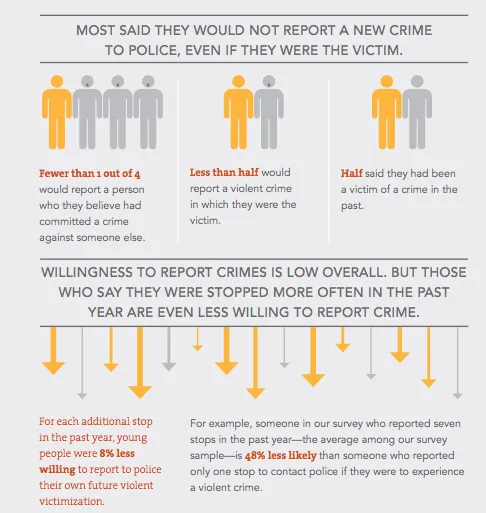 简而言之:在纽约,被拦截和搜身的年轻人似乎对警察的信任度降低,这使得他们在应该报警时不太可能拨打警察电话,从而使警察更难履行职责。即使是那些曾经是犯罪受害者的受访者,这种情况也是如此。维拉的报告指出:“在一年内每增加一次拦截,都会使一个人未来报告他或她可能经历的暴力犯罪的可能性下降八个百分点。”