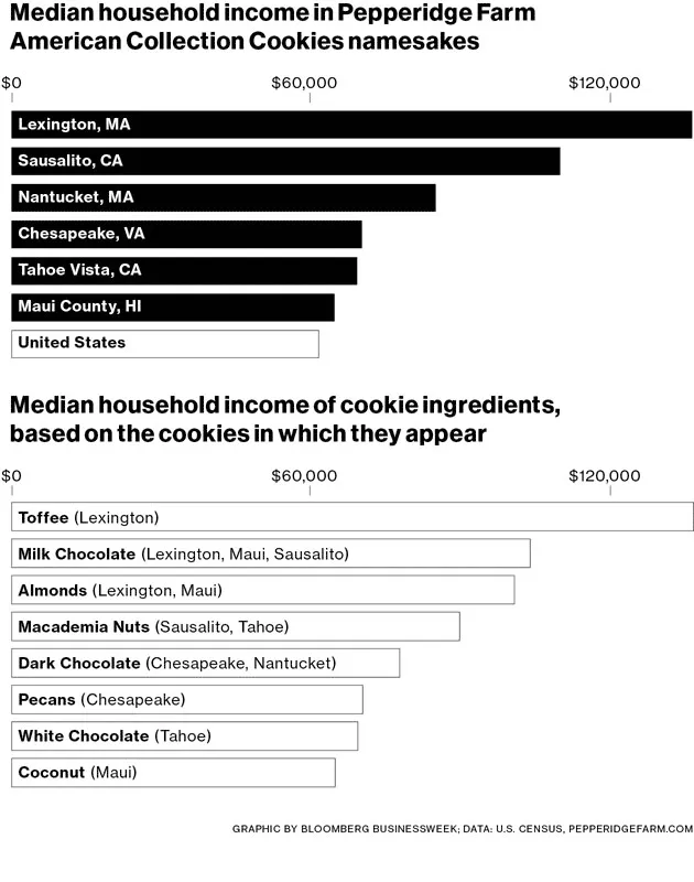 一旦你克服了饼干高管们认为波士顿郊区是度假目的地这一令人困惑的想法——也许他们是革命战争爱好者?——显而易见的是,马萨诸塞州的列克星敦不仅比其蓝草州的对应城市更富裕;它是佩佩里奇农场当前美国饼干系列中最富裕的城镇。看看吧,索萨利托。以下是佩佩里奇农场选择的度假城镇在家庭收入中位数上的比较。此外,还看看哪些饼干成分——从太妃糖到胡桃——与高收入城市相关。(请注意,一些成分,如牛奶巧克力,出现在几种饼干中。)
