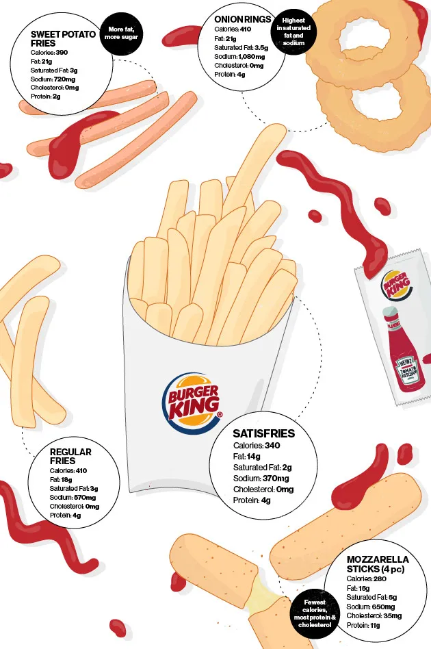 汉堡王的新薯条并不是旧食谱的替代品,发言人阿德里安娜·劳里切拉强调,健康的选择将仅在“根据顾客的反馈”提供。菜单上已经有多种油炸配菜,包括红薯薯条、洋葱圈,以及在某些地点提供的马苏里拉奶酪条。另一方面,麦当劳只提供普通薯条,来自其冒泡的油锅。为了比较,一份中等的Satisfries比麦当劳的中等薯条少40卡路里和5克脂肪,但汉堡王的中等盒装薯条的份量也大约大三分之一,157克对比117克。